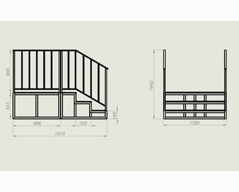 Каркас лестницы выполнен из профильной трубы 40х40 , 40х20 и 20х20 Покрытие ступеней – просечно-вытяжной лист 4мм (может быть заменен на другое покрытие по желанию заказчика) Конструкция имеет съемные элементы перил Покраска полимерная порошковая с предварительным нанесением цинкосодержащего грунта.