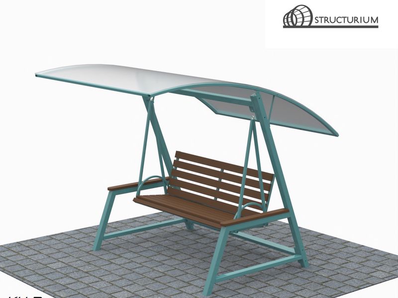 При производстве Садовых качелей используется профильная труба 60*60*3мм, 60*40*3мм и 40*25*2мм. Материал обшивки скамьи – доска 75*25мм. Материал обшивки крыши – прозрачный сотовый поликарбонат 8мм. Покраска полимерная порошковая с предварительным нанесением цинкосодержащего грунта, цвет бирюзовый.